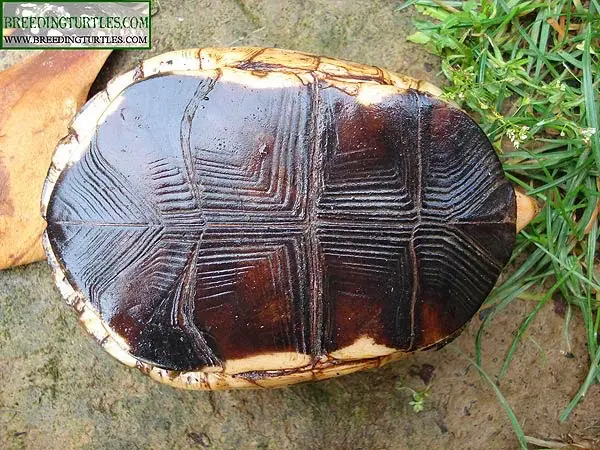 Morfología: Tiene el caparazón de color marrón, con el centro de los escudos más claro, de color anaranjado. Tiene una quilla longitudinal de color naranja claro.