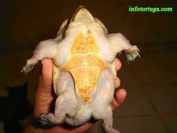 Morfología: Esta especie es bastante peculiar: tiene un caparazón de tonos marrones oscuros.. Algunos ejemplares presentan un caparazón un poco más claro y se puede observar un suave dibujo jaspeado de color más oscuro. En muchas ocasiones estas tortugas tienen el caparazón completamente cubierto por musgo.