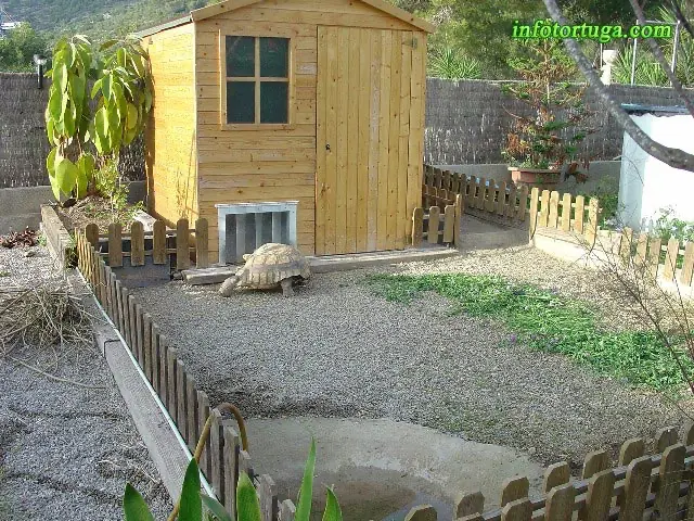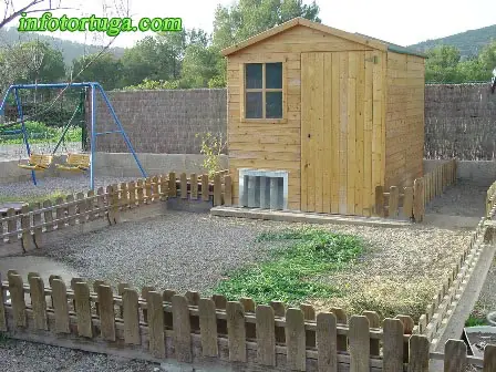 – Habilitar unas instalaciones al aire libre, consistentes en un recinto exterior con una valla muy sólida (aunque no necesariamente deberá ser muy alta) y con una pequeña caseta donde puedan refugiarse los días más fríos. El recinto exterior deberá construirse en una zona muy soleada y poco húmeda, y deberá tener un punto de agua y algunos arbustos, árboles o parasoles donde ocultarse del sol en algunas horas de los meses más cálidos. La caseta deberá tener las características explicadas en el punto anterior, además de tener una pequeña puerta hecha con cintas de plástico superpuestas por donde puedan entrar y salir las tortugas, sin que pueda entrar el frío del invierno.