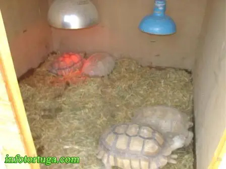– Habilitar un terrario de gran tamaño o una habitación, donde se pueda regular la temperatura con algún calefactor o con bombillas. Estos terrarios deberán tener lámparas cerámicas para mantener el calor, luz uva/uvb para que las tortugas puedan absorber todas las vitaminas necesarias y algunas lámparas tipo spot (como las conocidas Powersun) que creen algún punto de calor para asolearse. Debería haber por lo menos 40-50 cm de profundidad de substrato para que puedan enterrarse en caso de bajar las temperaturas, y como se recomienda en la ficha de cada especie, deben tener algún punto de agua para beber y bañarse, un comedero, algunas plantas donde ocultarse, …