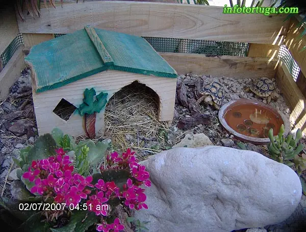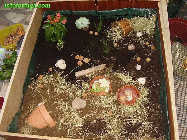 Al igual que con las tortugas adultas, en estos recintos deberemos poner algún pequeño plato con agua de 2-3 cm de profundidad y algún tipo de cueva donde puedan resguardarse.