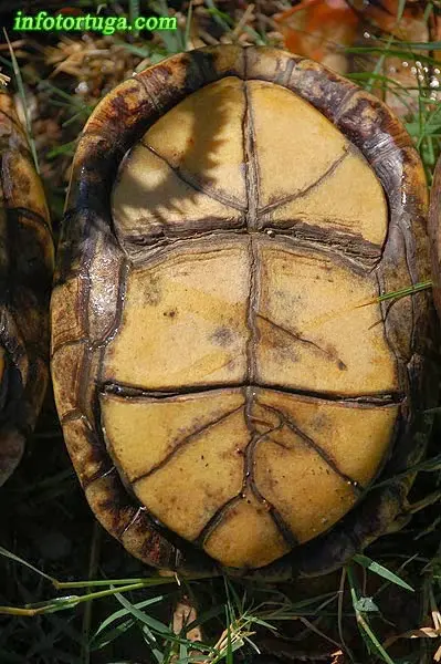 El plastrón es entre amarillo y naranja-marrón, sin dibujos.
