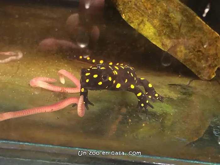 Cuando están en fase terrestre suele preferir larvas de insectos y grillos.