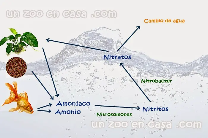Los restos de vegetación muerta, comida de peces o tortugas, y deposiciones de los animales generan amoníaco y amonio. Gracias al trabajo de unas bacterias llamadas Nitrosomonas se convierten estos elementos en Nitritos, que posteriormente gracias a las Nitrobacter son convertidos a su vez en Nitratos. Estos nitratos serán asimilados posteriormente por las plantas o a través de cambios de agua del acuario.