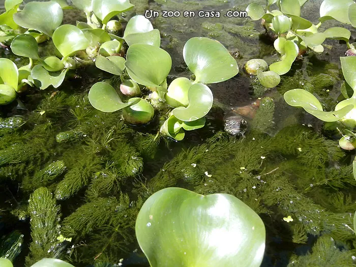 – Tortugas: Tal y como se ha detallado las tortugas suelen ensuciar bastante. La principal ventaja que nos proporcionan es que pueden alimentarse de los restos de animales muertos y plantas, evitando la generación de más nitratos en un futuro. Hay que tener en cuenta la especie de tortuga que va a albergar el estanque, puesto que sus hábitos y su tamaño nos condicionarán mucho la construcción del estanque. Cuanto mayores sean las tortugas más profundidad y volumen de agua necesitaremos. También debemos tener en cuenta que algunas tortugas, como las de los géneros Pseudemys o Trachemys, pueden alimentarse de las plantas (que a su vez nos interesaría mantener para que realicen la filtración). Otras especies como Emys orbicularis, género Mauremys o Clemmys guttata son menos destructivas y mantienen mucho mejor la vegetación.