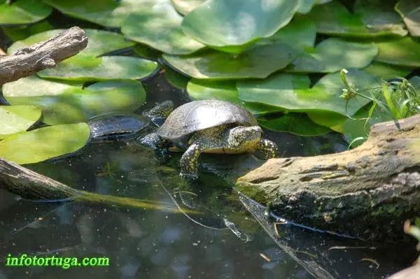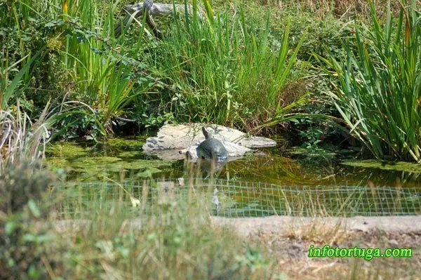 En este estanque los bordes son bajos y suaves, lo que permite a estas Mauremys leprosa salir sin problemas – Imagen de Enric Pàmies