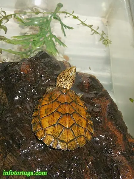Mantenimiento: Esta especie se debería mantener al aire libre. Debe tener un recinto con un pequeño estanque, que puede tener más de medio metro de profundidad. Debe disminuir la profundidad de forma gradual, para que las tortugas puedan salir del agua sin dificultades, ya que son muy malas nadadoras.