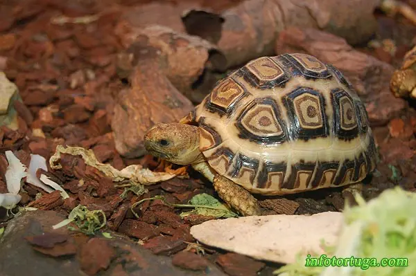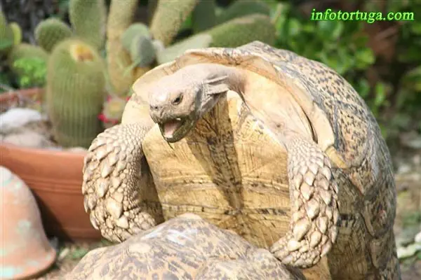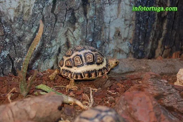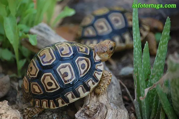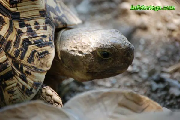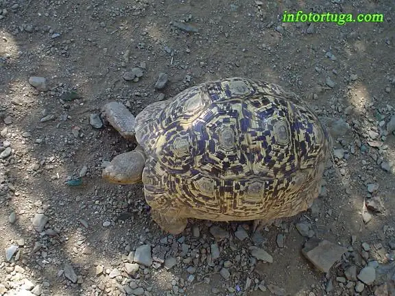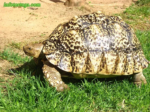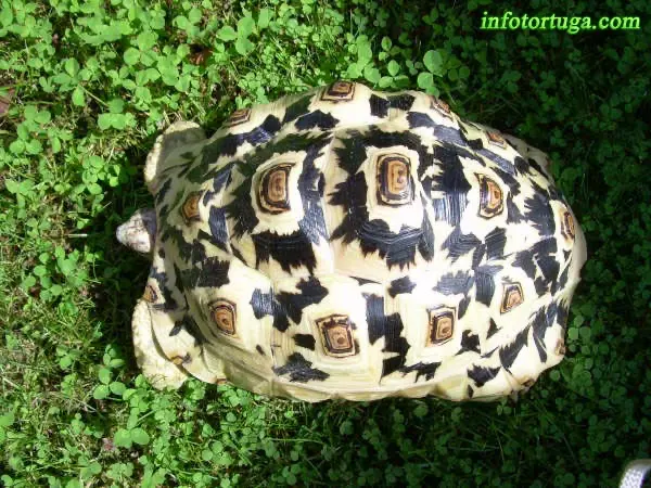 Morfología: Esta especie de tortuga recibe el nombre de tortuga leopardo debido a que tiene el caparazón de color claro con manchas negras, que pueden recordar a la coloración del leopardo.