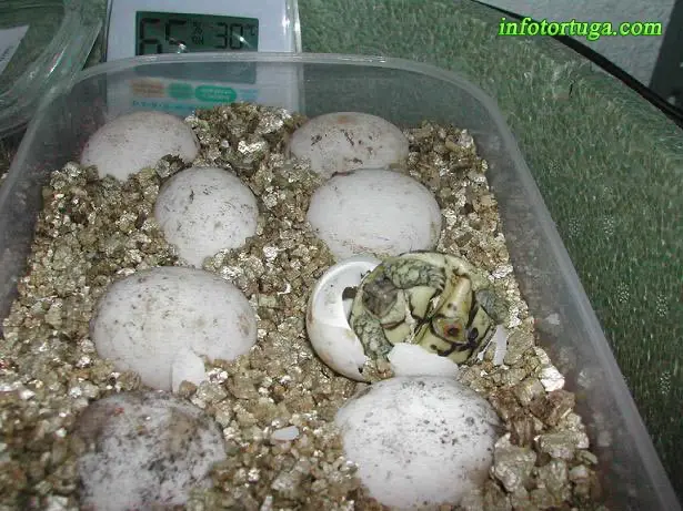 Las crías cuando nacen miden entre 4 y 5 cm. La incubadora debe estar entre 28 y 30 ºC, y la humedad deberá ser de un 80 %. El tiempo de incubación está entre 140 y 180 días, aunque en libertad puede durar casi un año (dependiendo de las condiciones climatológicas).