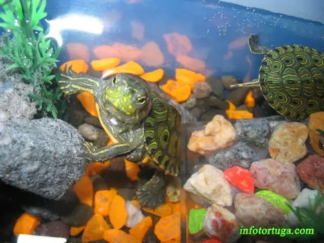 Alimentación: Para el buen crecimiento de estas tortugas es necesaria una alimentación equilibrada. Nunca se les debe dar gammarus o gambitas secas demasiado a menudo, ya que muchas personas se lo dan como alimento único y con el tiempo la tortuga sufre diferentes enfermedades derivadas de la falta de vitaminas.